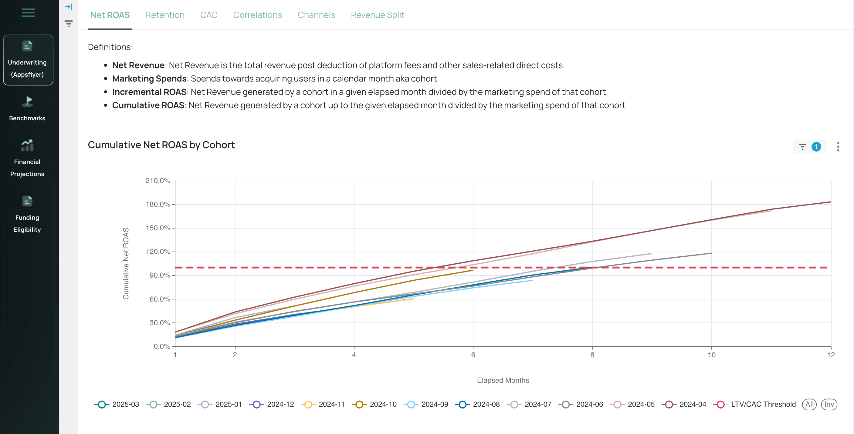 Our suite of features—from ROAS benchmarking and predictive cohort modeling to PvX Scoring and funding eligibility—has been purpose-built to help you understand, forecast, and optimize your user acquisition outcomes. Whether you're comparing your ROAS against peers, projecting performance over the next 12 months, or assessing your readiness for growth capital, each view is designed to turn complex data into actionable insights.