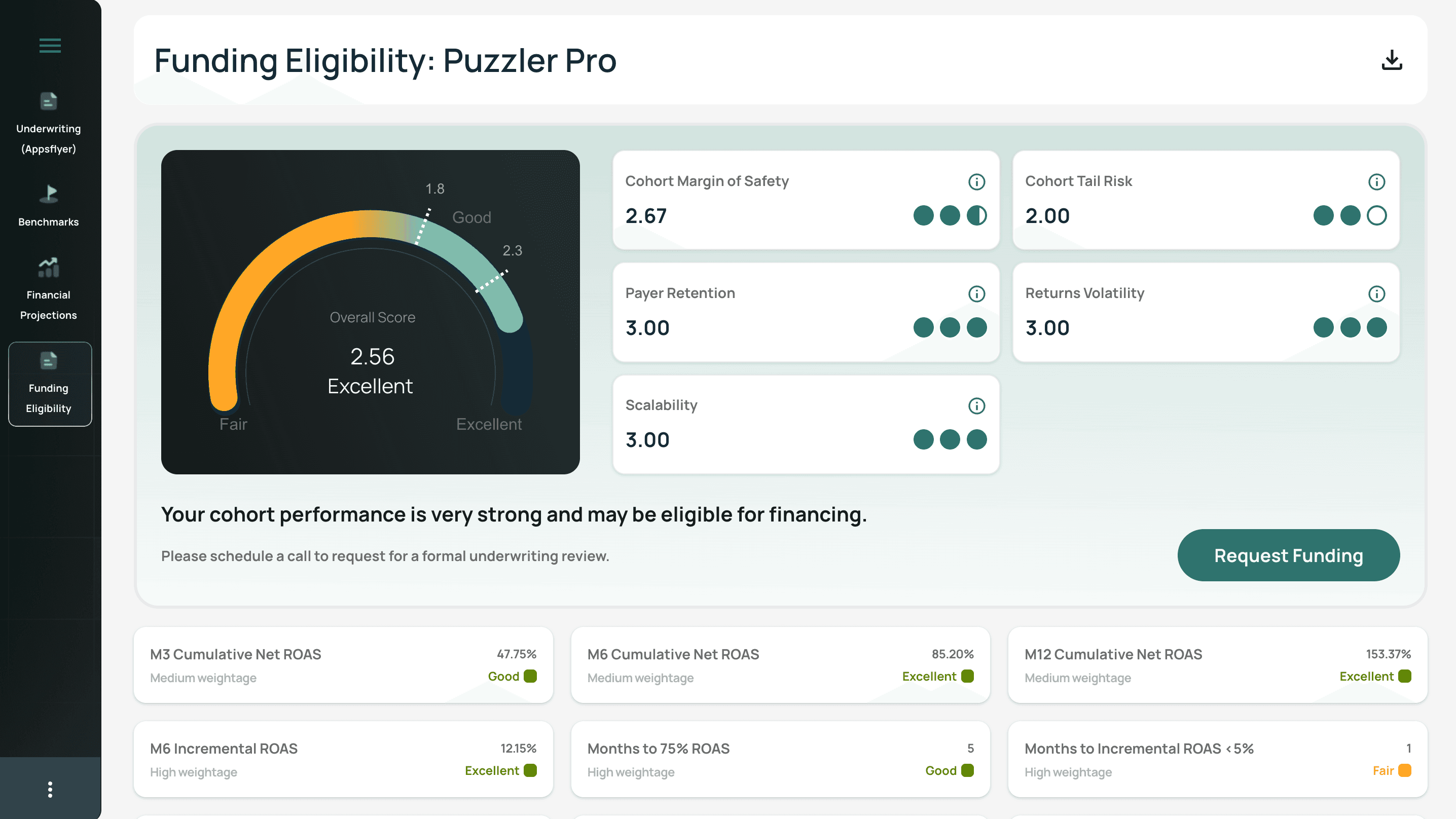 Scores above 1.8 indicate strong, scalable performance and unlock access to cohort financing opportunities. If your score is currently below the threshold, we provide clear, actionable guidance on what needs improvement—whether it’s improving M1 retention, increasing ROAS at scale, or reducing cohort volatility.